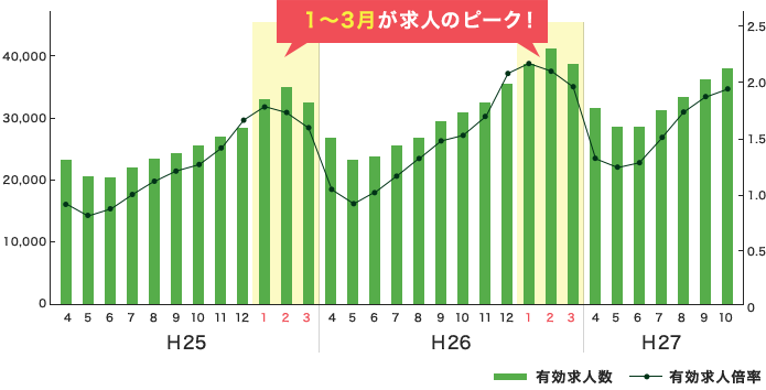 グラフをみると、保育士求人のピーク時期は1~3月となります。