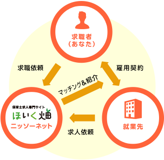 当社では、求職者様と保育施設様との間に立って、ご希望にあわせてマッチングしていく「職業紹介サービス」を提供しています。